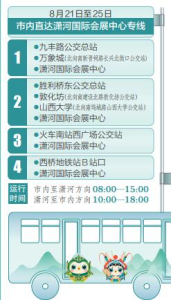 太原市將在山西文博會期間開通5條免費(fèi)公交接駁專線。其中,4條市內(nèi)直達(dá)瀟河國際會展中心的專線,分別從九豐路公交總站—萬象城(北向南新晉祠路長興北街口公交站)—瀟河國際會展中心;勝利橋東公交總站—敦化坊(北向南建設(shè)北路敦化坊公交站)—山西大學(xué)(北向南塢城路山西大學(xué)公交站)—瀟河國際會展中心;火車南站西廣場公交站—瀟河國際會展中心;西橋地鐵站B站口—瀟河國際會展中心。運(yùn)行時間為市內(nèi)至瀟河方向8:00—15:00,瀟河至市內(nèi)方向10:00—18:00。此外,為便于駕車自行前往的市民出行,還開通了1條社會停車場至山西瀟河國際會展中心的免費(fèi)接駁線路。該線路從先行路瀟河大街口經(jīng)先行路至?xí)怪行耐颠\(yùn)行,在智慧南街口、先行路樂商街口???,運(yùn)行時間為9:00—18:00。