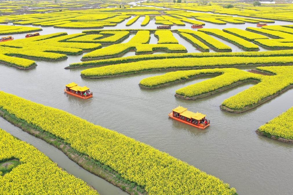 ??2023年3月29日,游客乘坐畫舫欣賞千垛菜花風(fēng)景區(qū)兩岸油菜花(無(wú)人機(jī)照片)。新華社記者 毛俊 攝