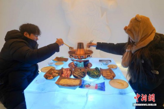 在用雪打造的屋子里,羊肉片、凍豆腐、青菜拼盤等食材已經(jīng)擺好,陸續(xù)有游客前來體驗(yàn)雪屋火鍋的“冷熱交替”。“外面零下二三十度,吃著沸騰的火鍋很刺激。”北京游客劉博俊說。