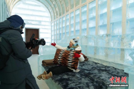 冰堡體驗(yàn)休息室布置了冰床、冰沙發(fā)等冰制陳設(shè),讓游客沉浸式體驗(yàn)冰雪住宿的新奇樂趣。 趙宇航 攝