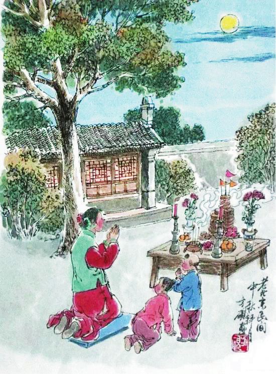 “中秋月。月到中秋偏皎潔?!辟p月是中秋節(jié)的重要習(xí)俗,我國(guó)民間的中秋賞月活動(dòng)約始于魏晉時(shí)期,盛于唐朝,當(dāng)時(shí)許多名篇佳作中都有詠月的詩(shī)句。北宋時(shí)期,以賞月活動(dòng)為中心的中秋節(jié)已成為普遍的民俗節(jié)日,然而與唐代不同的是,宋代關(guān)于賞月的作品多是感物傷懷,以陰晴圓缺喻人情世態(tài)。宋代的中秋夜是不眠之夜,夜市通宵營(yíng)業(yè),游人絡(luò)繹不絕,《東京夢(mèng)華錄》中載:“中秋節(jié)前,諸店皆賣新酒,貴家結(jié)飾臺(tái)榭,民家爭(zhēng)占酒樓玩月,笙歌遠(yuǎn)聞千里,嬉戲連坐至?xí)浴!币恍┑胤缴踔亮鱾鳌爸星镆乖酵硭介L(zhǎng)壽”的說(shuō)法,于是有了守夜的習(xí)俗。守夜時(shí),家里長(zhǎng)輩通常會(huì)給小孩講關(guān)于月亮的故事,如嫦娥奔月、吳剛伐桂等,孩子們個(gè)個(gè)聽(tīng)得津津有味。