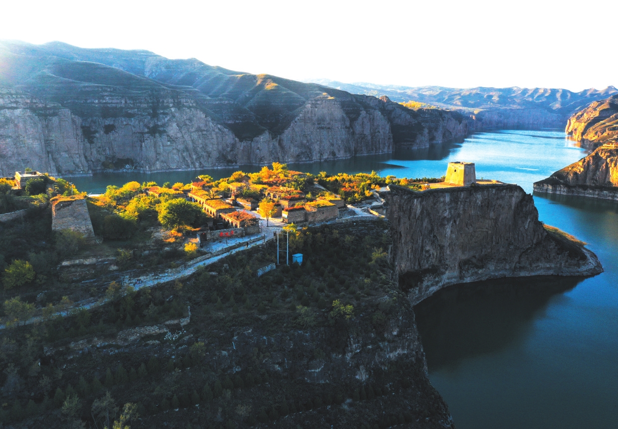 2015年的夏天,我又一次來到老牛灣,105米高的萬家寨水電大壩飛跨晉蒙,黃河水在絕壁中安靜了、變綠了。老牛灣村前的小河倒灌進(jìn)了黃河水,一個灣成了兩個灣,團(tuán)團(tuán)地圍住了山村,又好似老牛彎出了兩個碧綠的牛角,太漂亮了。老鄉(xiāng)們說:“有企業(yè)來開發(fā)道路、景區(qū)了,也有北京游客開車來游玩了,拍照的多,照幾張相就走了?!蓖侨匀粴埰频拈T樓和石板院房,我不知該說什么、能說什么。