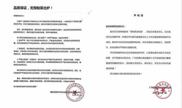 目前,還有多家餐飲公司回應(yīng)。9月7日,廣州多滿分食品有限公司發(fā)聲明稱,學生餐均是就餐當天上午在央廚新鮮現(xiàn)場制作完成的。