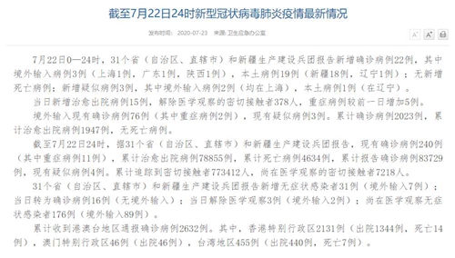 人民網(wǎng)北京7月23日電(董童)國家衛(wèi)生健康委于今日在官網(wǎng)發(fā)布的《截至7月22日24時新型冠狀病毒肺炎疫情最新情況》(以下簡稱“情況”)提出,7月22日0—24時,31個?。ㄗ灾螀^(qū)、直轄市)和新疆生產(chǎn)建設兵團報告新增確診病例22例,其中境外輸入病例3例(上海1例,廣東1例,陜西1例),本土病例19例(新疆18例,遼寧1例);無新增死亡病例;新增疑似病例3例,其中境外輸入病例2例(均在上海),本土病例1例(在遼寧)。當日新增治愈出院病例15例,解除醫(yī)學觀察的密切接觸者378人,重癥病例較前一日增加5例。