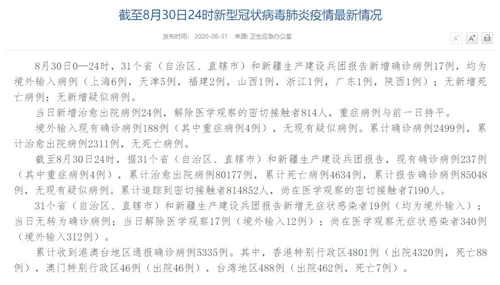 情況顯示,截至8月30日24時,據(jù)31個?。ㄗ灾螀^(qū)、直轄市)和新疆生產(chǎn)建設兵團報告,現(xiàn)有確診病例237例(其中重癥病例4例),累計治愈出院病例80177例,累計死亡病例4634例,累計報告確診病例85048例,無現(xiàn)有疑似病例。累計追蹤到密切接觸者814852人,尚在醫(yī)學觀察的密切接觸者7190人。