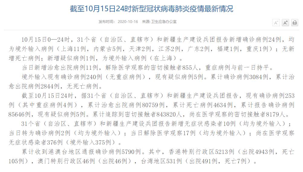 人民網(wǎng)北京10月16日電(董童)國家衛(wèi)生健康委于今日在官網(wǎng)發(fā)布的《截至10月15日24時新型冠狀病毒肺炎疫情最新情況》(以下簡稱“情況”)提出,10月15日0—24時,31個?。ㄗ灾螀^(qū)、直轄市)和新疆生產(chǎn)建設(shè)兵團(tuán)報告新增確診病例24例,均為境外輸入病例(上海11例,內(nèi)蒙古5例,天津2例,江蘇2例,廣東2例,福建1例,重慶1例);無新增死亡病例;新增疑似病例1例,為境外輸入病例(在上海)。當(dāng)日新增治愈出院病例11例,解除醫(yī)學(xué)觀察的密切接觸者855人,重癥病例與前一日持平。