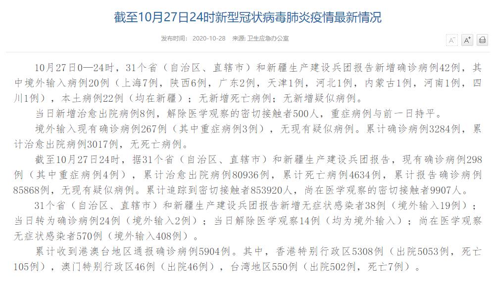 人民網(wǎng)北京10月28日電(董童)國家衛(wèi)生健康委于今日在官網(wǎng)發(fā)布的《截至10月27日24時新型冠狀病毒肺炎疫情最新情況》(以下簡稱“情況”)提出,10月27日0—24時,31個省(自治區(qū)、直轄市)和新疆生產(chǎn)建設兵團報告新增確診病例42例,其中境外輸入病例20例(上海7例,陜西6例,廣東2例,天津1例,河北1例,內(nèi)蒙古1例,河南1例,四川1例),本土病例22例(均在新疆);無新增死亡病例;無新增疑似病例。當日新增治愈出院病例8例,解除醫(yī)學觀察的密切接觸者500人,重癥病例與前一日持平。