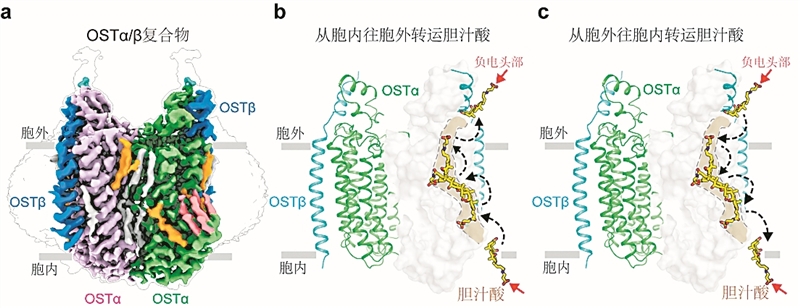 圖為OSTα/β蛋白結(jié)構(gòu)及轉(zhuǎn)運(yùn)機(jī)制模型示意圖。受訪單位供圖