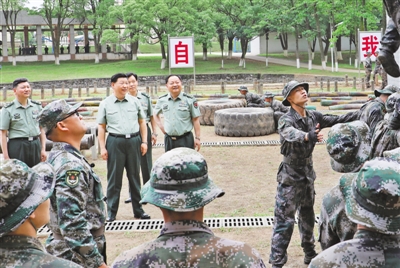 學(xué)院訓(xùn)練場(chǎng)上,學(xué)員們生龍活虎、喊聲震天,一派實(shí)戰(zhàn)化練兵景象。習(xí)近平走到障礙訓(xùn)練場(chǎng)旁,察看學(xué)員進(jìn)行障礙訓(xùn)練情況。極限訓(xùn)練對(duì)于錘煉學(xué)員體能極限、意志極限、心理極限,提高戰(zhàn)場(chǎng)適應(yīng)能力很有意義。習(xí)近平步行進(jìn)入極限訓(xùn)練場(chǎng),詳細(xì)了解有關(guān)訓(xùn)練設(shè)施和訓(xùn)練情況。學(xué)員們進(jìn)行了阻絕墻跳水、翻越懶人梯、跨越步步高、翻越高墻、攀爬云梯、攀越高空蕩木橋、扛圓木等訓(xùn)練??吹綄W(xué)員們摸爬滾打一身泥水,迎著障礙一往無前,習(xí)近平很高興。