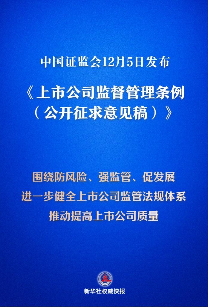新華社北京12月5日電(記者劉羽佳)中國(guó)證監(jiān)會(huì)5日發(fā)布《上市公司監(jiān)督管理?xiàng)l例(公開(kāi)征求意見(jiàn)稿)》,我國(guó)將迎來(lái)首部專門(mén)的上市公司監(jiān)管行政法規(guī)。