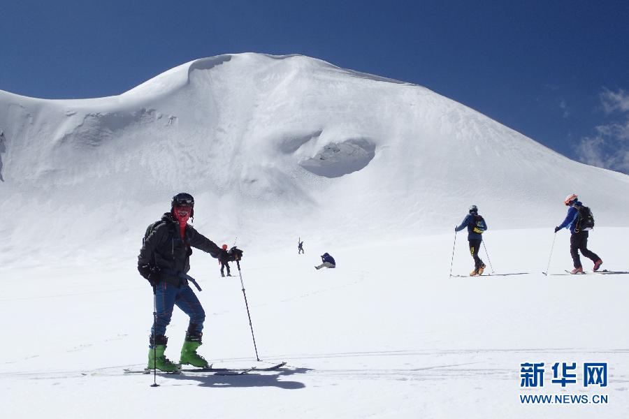 ↑記者第一次見到劉百靈是在第十六屆西藏登山大會(huì)滑雪登山項(xiàng)目的營(yíng)地——洛堆峰雪線處,海拔5600米。劉百靈膚色黑得發(fā)亮,與身邊長(zhǎng)年從事高山訓(xùn)練的藏族教練無(wú)異。但細(xì)問起來(lái),他說自己生在湖南,現(xiàn)居杭州,是地道的南方人。 因?yàn)閷?duì)戶外運(yùn)動(dòng)尤其是對(duì)滑雪的執(zhí)著,劉百靈的膚色變了,過起了旁人眼中的另一種人生,也成了“異類”。但他卻感謝自己成了“異類”。這是10月4日,滑雪愛好者、“體育旅游”探索者劉百靈(左)在位于西藏自治區(qū)當(dāng)雄縣羊八井鎮(zhèn)的洛堆峰雪坡上練習(xí),此處海拔約5700米。遠(yuǎn)處的山峰是海拔7048米的窮母崗日峰。 新華社發(fā)