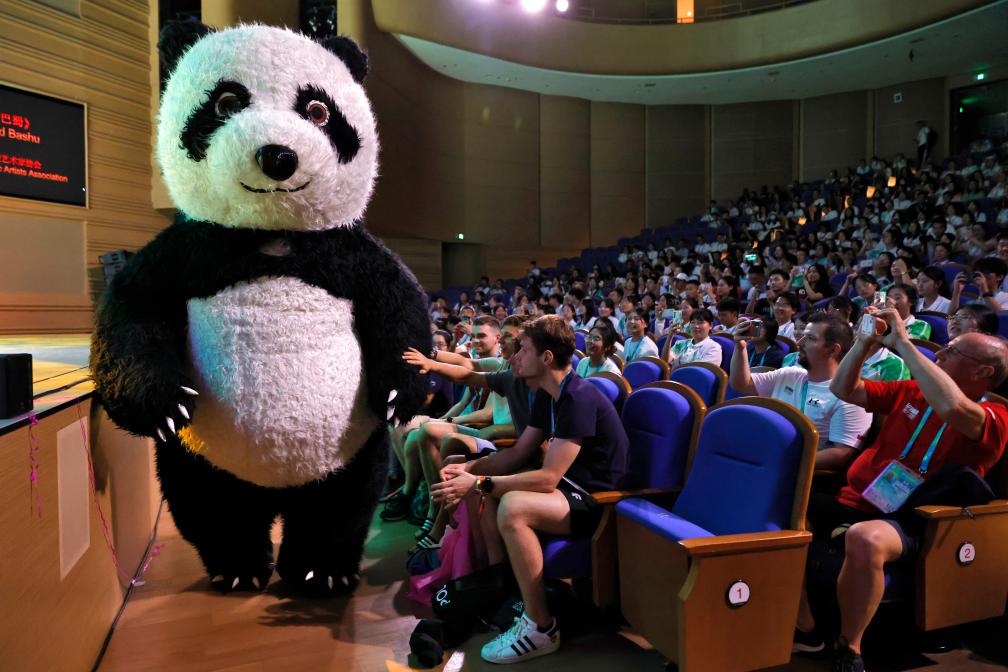 8月2日,一名演員裝扮成大熊貓在演出間隙與觀眾互動。當日,“奇幻之夜”雜技魔術晚會在成都大運村藝術中心大劇場舉行。本場活動是在大運村舉辦的“Be Together”主題系列晚會之一。新華社記者沈伯韓攝