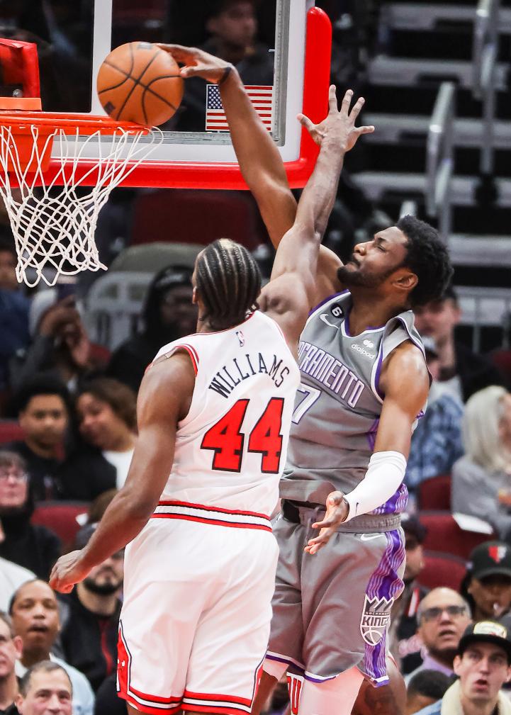 3月15日,效力于薩克拉門托國王隊的愛德華茲(右)在比賽中扣籃。當日,在2022-2023賽季NBA常規(guī)賽中,薩克拉門托國王隊客場以117:114戰(zhàn)勝芝加哥公牛隊。新華社發(fā)(喬爾·萊納攝)