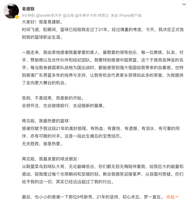 8月29日深夜,易建聯(lián)在個人自媒體上宣布正式告別籃球職業(yè)生涯。