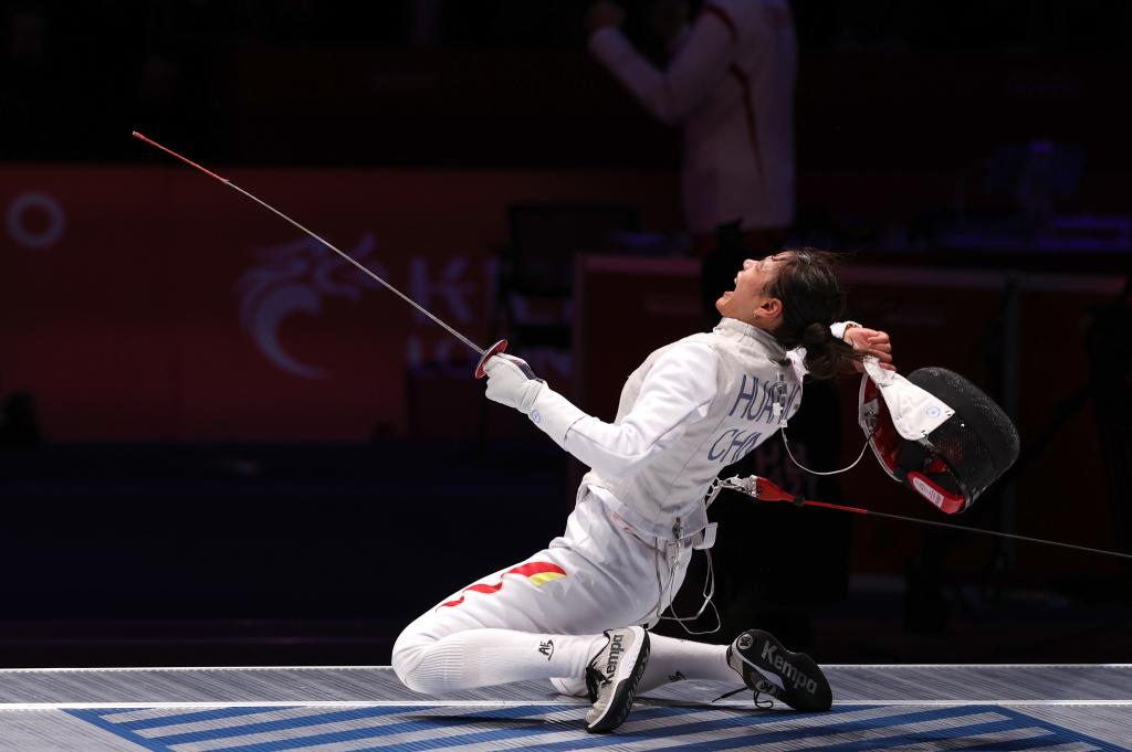 開局互相試探后,東晟良率先發(fā)起進(jìn)攻,被黃芊芊化解。在令人窒息的緊張氛圍中,兩人幾乎同時出手,黃芊芊刺中對手右肩,亮燈得分,她一把摘下面罩,怒吼慶祝。