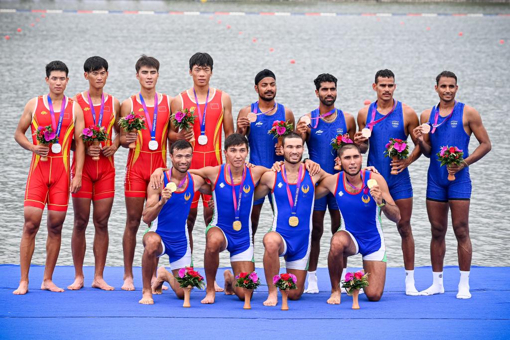 9月25日,男子四人單槳無舵手頒獎儀式上,冠軍烏茲別克斯坦隊(前)、亞軍中國隊(后左)、季軍印度隊合影。新華社記者 江漢 攝