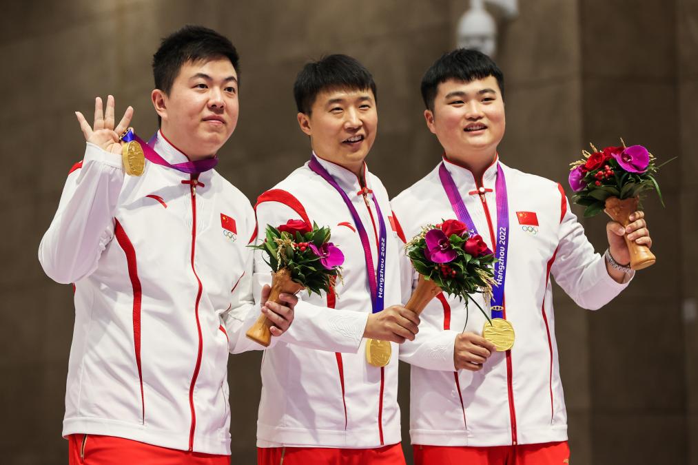 9月25日,男子25米手槍速射爭奪中,王鑫杰、劉楊攀、李越宏組成的中國隊(duì)以1765環(huán)的破世界紀(jì)錄成績奪得團(tuán)體冠軍。