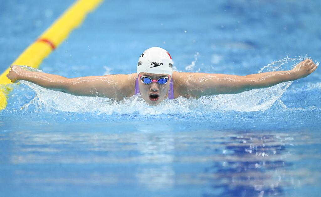 9月24日,中國隊(duì)選手張雨霏在女子200米蝶泳決賽中以2分05秒57破賽會紀(jì)錄的成績奪冠。