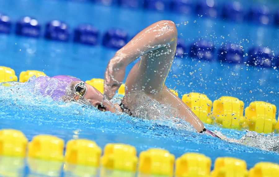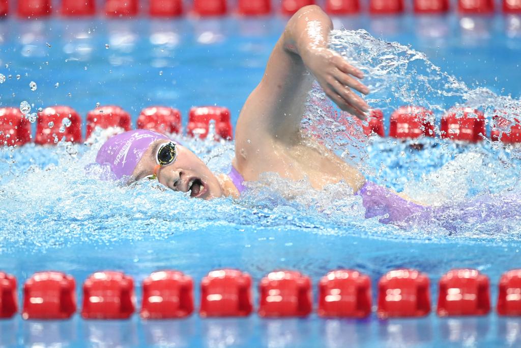 9月24日,中國隊(duì)選手李冰潔以15分51秒18破賽會紀(jì)錄的成績摘得女子1500米自由泳金牌。
