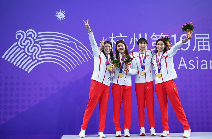 9月24日,女子4x100米自由泳接力決賽,由楊浚瑄、程玉潔、吳卿風(fēng)和張雨霏組成的中國隊(duì)優(yōu)勢明顯,最終以3分33秒96破賽會紀(jì)錄的成績奪得冠軍。
