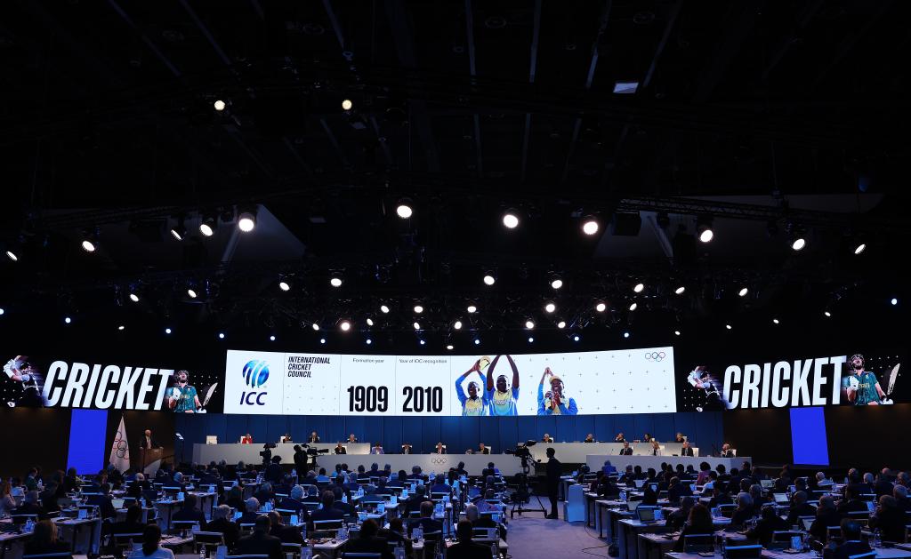 這是10月16日在印度孟買舉行的國(guó)際奧委會(huì)第141次全會(huì)現(xiàn)場(chǎng)大屏幕展示的板球項(xiàng)目。新華社記者 曹燦 攝