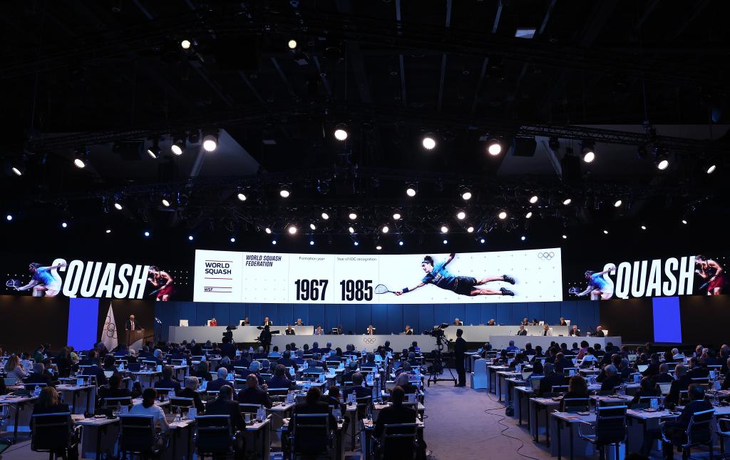這是10月16日在印度孟買舉行的國(guó)際奧委會(huì)第141次全會(huì)現(xiàn)場(chǎng)大屏幕展示的壁球項(xiàng)目。新華社記者 曹燦 攝