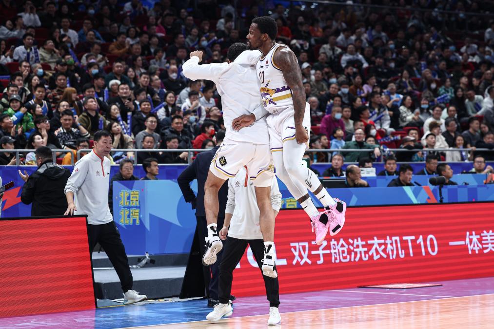 11月15日,北控隊(duì)球員費(fèi)爾德(右)與隊(duì)友在比賽中慶祝。新華社記者 吳壯 攝