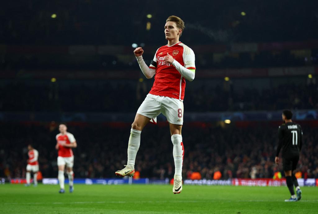 11月29日,阿森納隊球員厄德高在比賽中慶祝進(jìn)球。