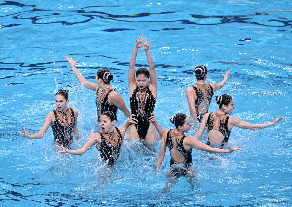 4月7日,中國(guó)隊(duì)在比賽中。當(dāng)日,在國(guó)家游泳中心“水立方”舉行的2024年花樣游泳世界杯(北京站)集體技巧自選比賽中,中國(guó)隊(duì)以205.0300分的成績(jī)獲得亞軍。新華社記者 夏一方 攝