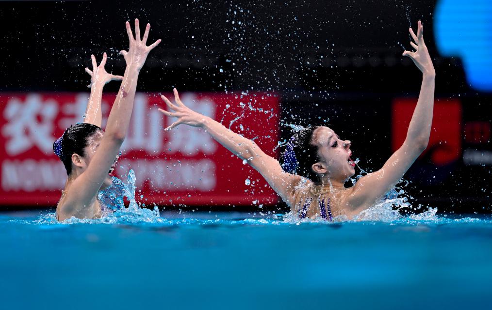 4月7日,中國(guó)組合林彥含/徐匯妍(右)在比賽中。當(dāng)日,在國(guó)家游泳中心“水立方”舉行的2024年花樣游泳世界杯(北京站)女子雙人自由自選比賽中,中國(guó)組合林彥含/徐匯妍以221.0156分的成績(jī)獲得亞軍。新華社記者 夏一方 攝