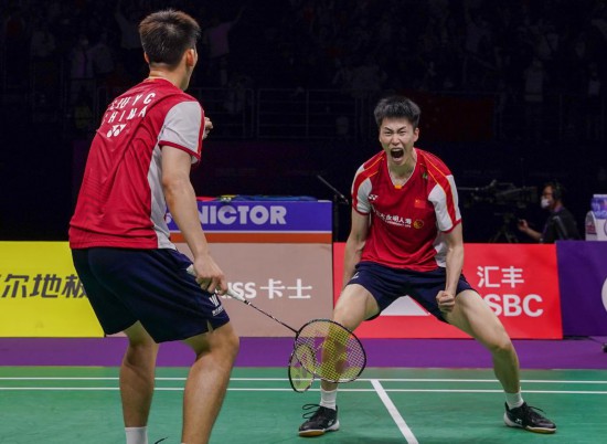 2023年5月20日,中國隊組合劉雨辰/歐烜屹(右)在2023年蘇迪曼杯世界羽毛球混合團體錦標賽半決賽男雙比賽后慶祝。新華社記者李博攝