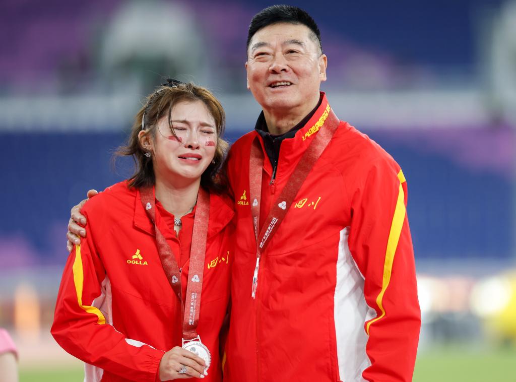 11月19日,獲得亞軍的四川隊選手吳艷妮(左)在頒獎儀式上哭泣。新華社記者 黃偉 攝