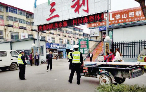 圖為三片區(qū)分指揮部工作人員在三利裝飾市場督查創(chuàng)衛(wèi)工作。