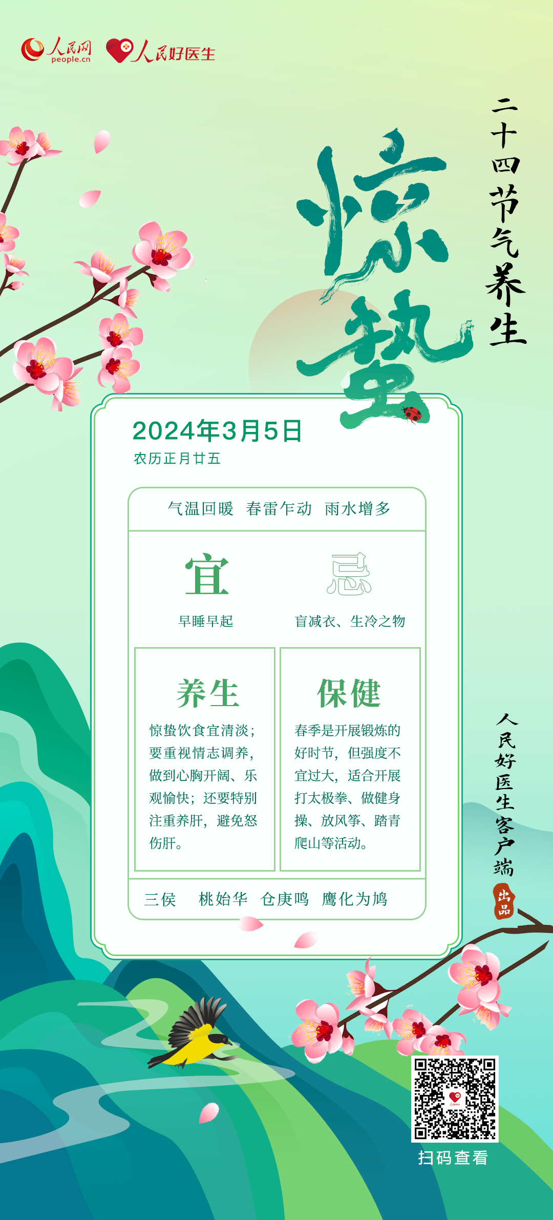 —年有四時(shí)變化,有24個(gè)節(jié)氣的更替,不同的節(jié)氣有不同的氣候,這些氣候變化與人體健康息息相關(guān)?!秱€(gè)人健康手冊(cè)(二十四節(jié)氣)》系列,是人民網(wǎng)·人民好醫(yī)生客戶端邀請(qǐng)知名中醫(yī)專家,根據(jù)二十四節(jié)氣的變化規(guī)律,通過(guò)防病調(diào)理、飲食養(yǎng)生、運(yùn)動(dòng)按摩等,調(diào)整人體節(jié)律,平衡陰陽(yáng),與自然界的陰陽(yáng)變化相應(yīng),從而達(dá)到健康養(yǎng)生的目的。想了解更多驚蟄養(yǎng)生知識(shí),請(qǐng)點(diǎn)擊查看《個(gè)人健康手冊(cè)(二十四節(jié)氣·驚蟄篇)》。