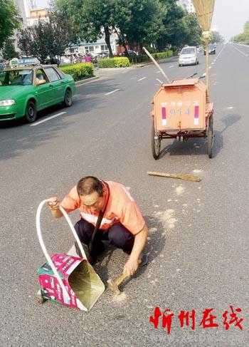 7月22日中午,忻州城區(qū)和平街,烈日當(dāng)頭,車水馬龍。這時記者看到在忻州師范學(xué)院路段,一位環(huán)衛(wèi)工人手執(zhí)小鐵錘,一絲不茍蹲在馬路上敲打撒落在路面上的粘泥,然后再用掃帚認(rèn)真清理干凈。這種敬業(yè)精神,值得大家學(xué)習(xí)。(赫在榮 攝)
