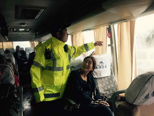 外勤稽查在檢查客車逃生設(shè)備