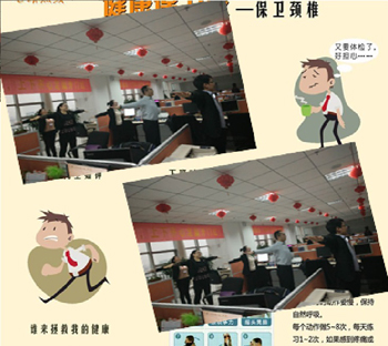 開門紅戰(zhàn)役打響,全員全身心投入,同時對職場內(nèi)員工的身體健康尤其是頸椎健康更是極大挑戰(zhàn)。中支綜管部門及時提醒辦公室內(nèi)的上班族,應該保護頸椎健康,提示半小時后應該起身活動一下,用頭寫“米”字,并適時組織員工停下手中的工作,打開電視機,集中做好工間勁椎操。保護頸椎,保護自己,服務公司,以充沛的體能服務開門紅戰(zhàn)役。