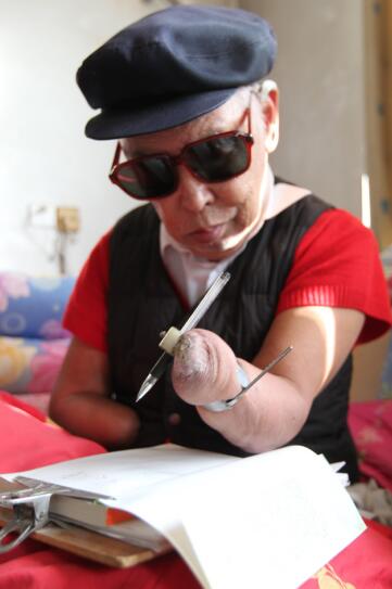 用嘴含筆寫(xiě),殘臂夾筆(抱臂)寫(xiě),鐵圈套筆寫(xiě)。整整7年??喟究鄬?xiě)了7年,反復(fù)修改了7遍。2000多個(gè)日日夜夜,父親翻爛了四本字典,很多時(shí)候,胳膊翻書(shū)不方便,他就用嘴唇翻,用舌頭翻。用掉半噸稿紙,終于在1996年7月,出版了33萬(wàn)字的自傳體小說(shuō)《極限人生》。