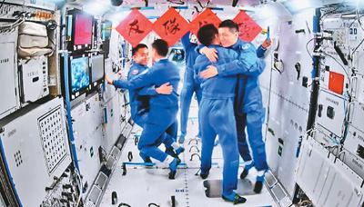 4月26日在軌執(zhí)行任務(wù)的神舟十七號航天員乘組順利打開“家門”,歡迎遠道而來的神舟十八號航天員乘組入駐“天宮”。新華社記者 金良快攝