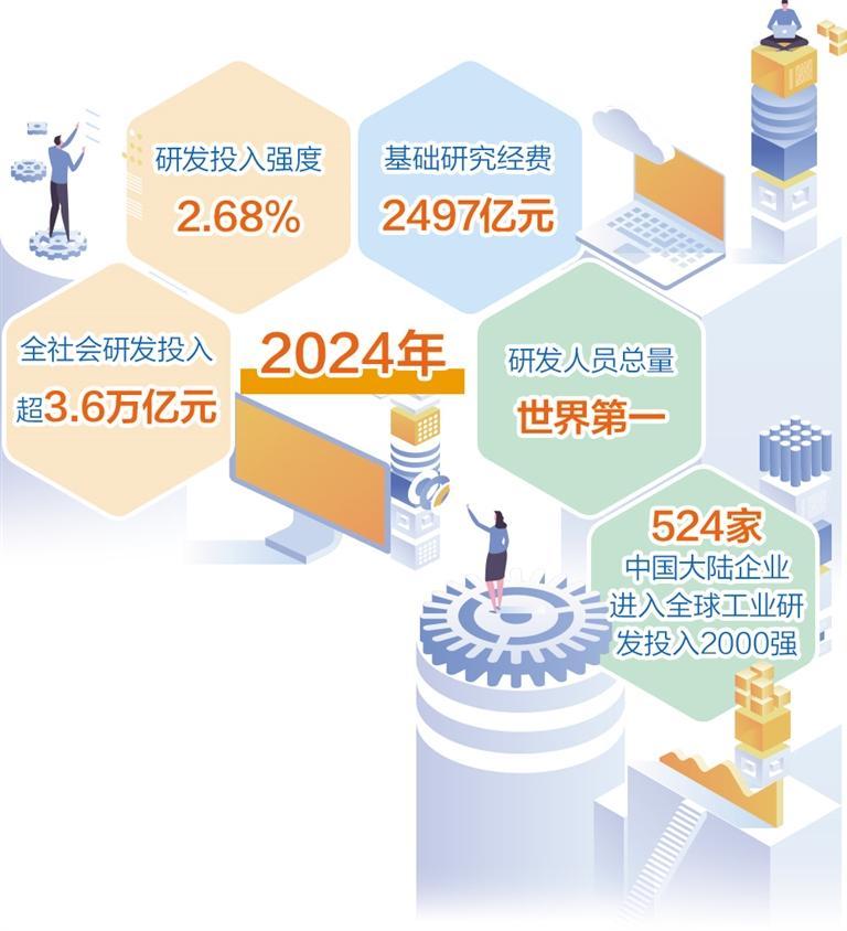 科技投入持續(xù)增加。2024年全社會研發(fā)投入超3.6萬億元,較2020年增長48%;研發(fā)投入強度達2.68%,超過歐盟國家平均水平;研發(fā)人員總量世界第一?;A研究經(jīng)費達2497億元,較2020年增長超過70%,在量子科技、生命科學、物質(zhì)科學、空間科學等領域取得一批重大原創(chuàng)性成果,高水平國際期刊論文數(shù)量和國際專利申請量連續(xù)5年世界第一。