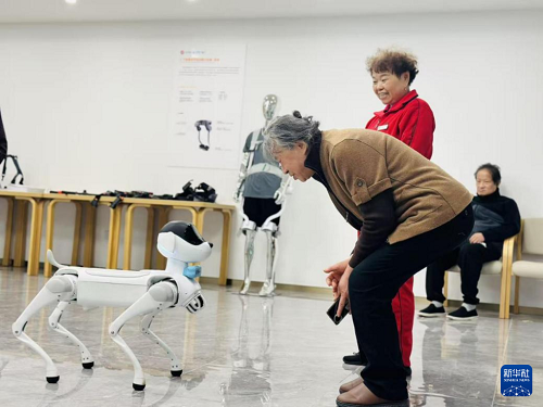 浙江烏鎮(zhèn)智能養(yǎng)老中心內(nèi),院內(nèi)老人正與機(jī)器狗互動(dòng)。新華網(wǎng)發(fā)(鐘月英 攝)