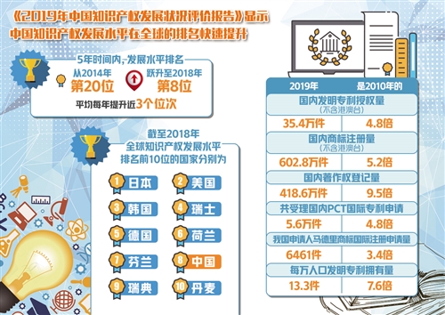 9月14日,中國國家知識產(chǎn)權(quán)局知識產(chǎn)權(quán)發(fā)展研究中心發(fā)布的《2019年中國知識產(chǎn)權(quán)發(fā)展?fàn)顩r評價(jià)報(bào)告》顯示,中國知識產(chǎn)權(quán)發(fā)展水平在全球的排名快速提升,短短5年時(shí)間內(nèi),排名已從2014年的第20位,快速躍升至2018年的第8位,平均每年提升近3個(gè)位次。