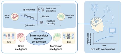天津大學(xué)與清華大學(xué)的聯(lián)合研究團(tuán)隊(duì)針對(duì)這一難題,發(fā)現(xiàn)腦電信號(hào)的非平穩(wěn)特性與任務(wù)腦電演變密切相關(guān)。基于此,他們創(chuàng)新性地提出了“雙環(huán)路腦機(jī)協(xié)同演進(jìn)框架”,并通過(guò)憶阻器神經(jīng)形態(tài)器件加以實(shí)現(xiàn)。在“雙環(huán)路”框架下,腦與機(jī)的學(xué)習(xí)環(huán)路相互協(xié)同,共同促進(jìn)系統(tǒng)性能的提升。