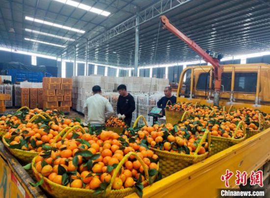 1月5日,在廣西南寧市西鄉(xiāng)塘區(qū)雙定鎮(zhèn)義平村,村民將剛采摘的砂糖橘打包裝箱供應(yīng)中國(guó)東北市場(chǎng)。中新社記者 黃艷梅 攝