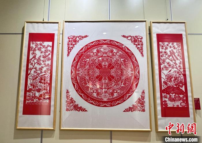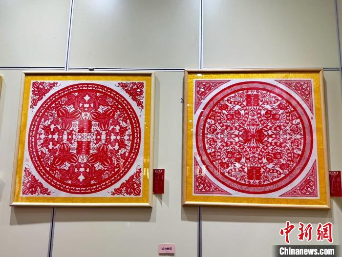 現(xiàn)場(chǎng)展出的盤合作品《中堂式盤合——龍鳳呈祥和和美美》。楊靜攝 5月7日,120幅由山西省級(jí)非遺項(xiàng)目(陽泉盤合)傳承人梁盛萍創(chuàng)作的剪紙作品正在山西太原文瀛公園展出。此次展出作品包括民風(fēng)民俗、文旅融合等主題,其中,展示山西傳統(tǒng)婚俗文化的“陽泉盤合”系列剪紙作品受游客圍觀。 剪紙?jiān)谏轿魇£柸杏蓙硪丫?,其中婚俗盤合剪紙是最為獨(dú)特的一種。在當(dāng)?shù)氐膫鹘y(tǒng)婚嫁習(xí)俗中,為增添喜慶熱烈的氣氛及表達(dá)對(duì)新人的祝福和期盼,會(huì)請(qǐng)當(dāng)?shù)孛耖g藝人為新人用紅紙剪盤合,在新婚前夕將盤合貼在洞房里,其內(nèi)容多為對(duì)愛情的美好祝福。