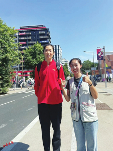 武晨曦(右)在巴黎和中國女排運動員朱婷合影。
