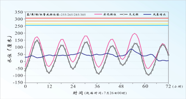 2023年7月28日“杜蘇芮”臺風風暴潮發(fā)生時,福建東山站實測潮位、天文潮和風暴增水隨時間變化情況,圖中清晰地反映出風暴潮與天文潮疊加后,實時潮位明顯升高。(資料來源:《2023中國海洋災害公報》)