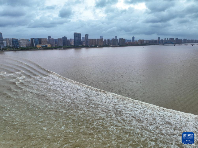 2024年9月19日拍攝的錢塘江潮水(無人機照片)。每年中秋節(jié)前后是錢塘江潮水的最佳觀賞期,被譽為“八月十八潮 壯觀天下無”。(圖片來源:新華社記者 江漢 攝)