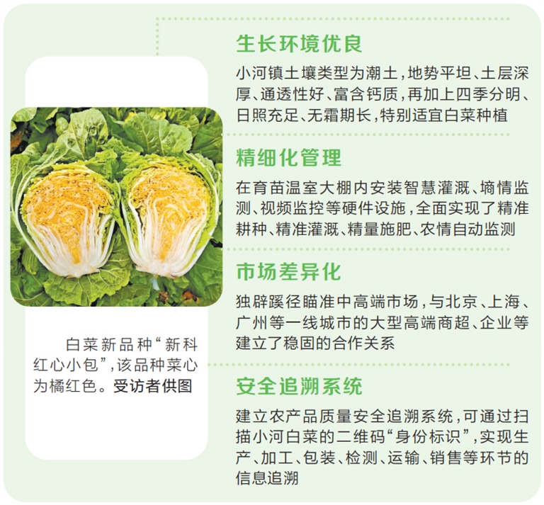 “小河白菜跳出‘白菜價’,我們最大的底氣便是好的品種培育?!本G源農(nóng)牧總經(jīng)理張躍民介紹,他從2008年開始流轉(zhuǎn)600余畝土地規(guī)?;N植小河白菜,品種大部分來自新鄉(xiāng)市農(nóng)科院蔬菜研究團隊。往年該公司主要種植的白菜品種為“新科小包26”,一棵也能賣到39元。