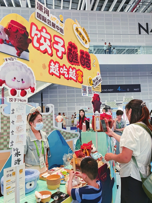 胖乎乎的餃子、圓墩墩的醋缸,摸一摸,毛絨絨的,手感柔順細(xì)滑。8月24日,第七屆山西文博會(huì)現(xiàn)場(chǎng),位于山西瀟河國(guó)際會(huì)展中心N4館的文創(chuàng)山西展區(qū),永濟(jì)市晉韻原創(chuàng)文創(chuàng)工作室獨(dú)特而醒目的門頭——“餃子蘸醋 越吃越富”,吸引了眾多參觀者的目光。該工作室展出的餃子蘸醋系列毛絨文創(chuàng)產(chǎn)品,也受到參觀者的關(guān)注和喜愛(ài)。